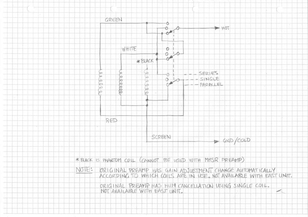 * It is possible to wire the ‘multi-wire’ 3 way switch according to the diagram we’ve sketched below but the current switch must be un-wired from the original circuit. This modification means our preamp will not change the gain according to which coils are selected (as was designed into the original circuit).